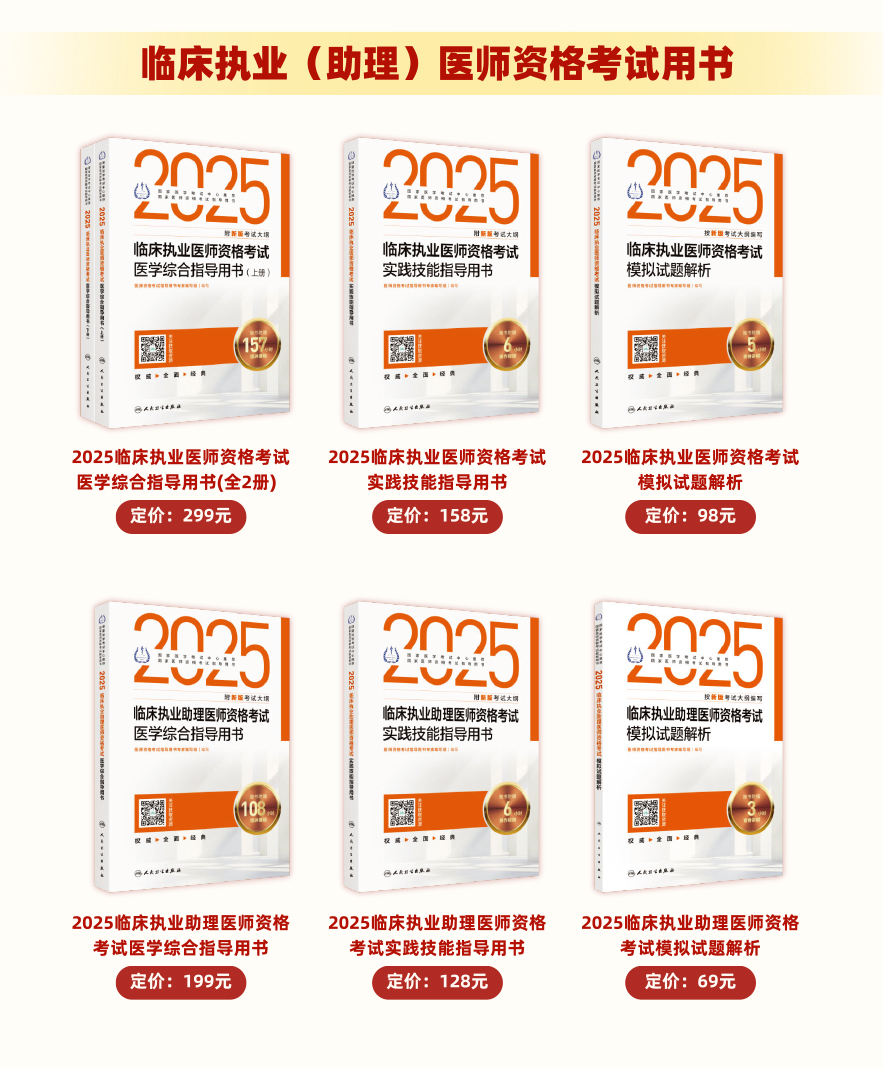 2025年版医师资格考试用书经国家医学考试中心授权,由人民卫生出版社独家出版,考生可通过人卫智慧服务商城,以及人民卫生出版社天猫、京东、抖音官方旗舰店购买正版图书。